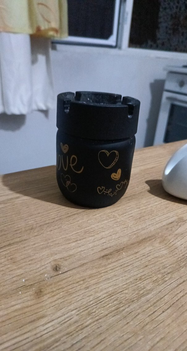 Altın renkli kalp desenleri ve "love" yazısı bulunan siyah mumluk. Mumları güvenle tutmak için sağlam yapıya sahip. ️