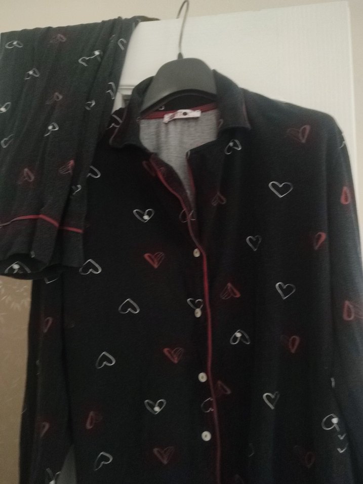 Siyah, kalp desenli, uzun kollu, rahat kesim midi uzunlukta pijama takımı.