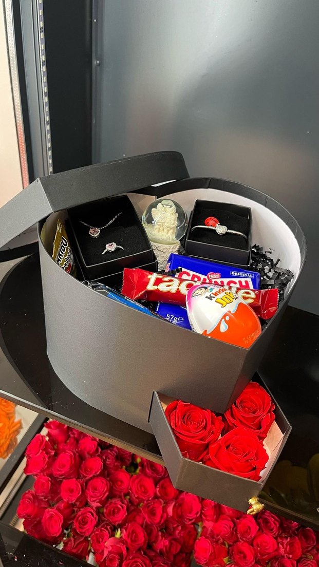 Siyah kalp kutu içinde takı, çikolata, küçük melek figürü ve kırmızı güller bulunan hoş bir hediye seti.