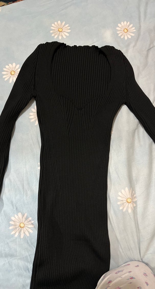 kalp yakalı, uzun kollu, fit kesim siyah fitilli triko kazak, rahat ve günlük kullanım için uygundur. S-M uyumludur