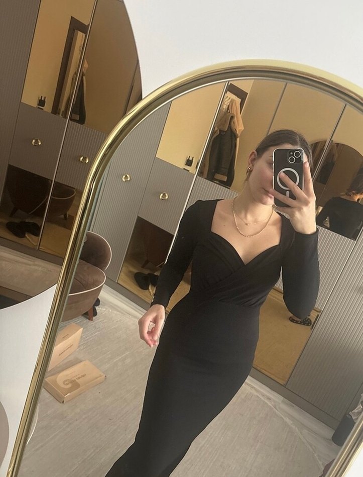 Siyah, uzun kollu midi elbise, likralı kumaş hiçbir sıkıntısı yok