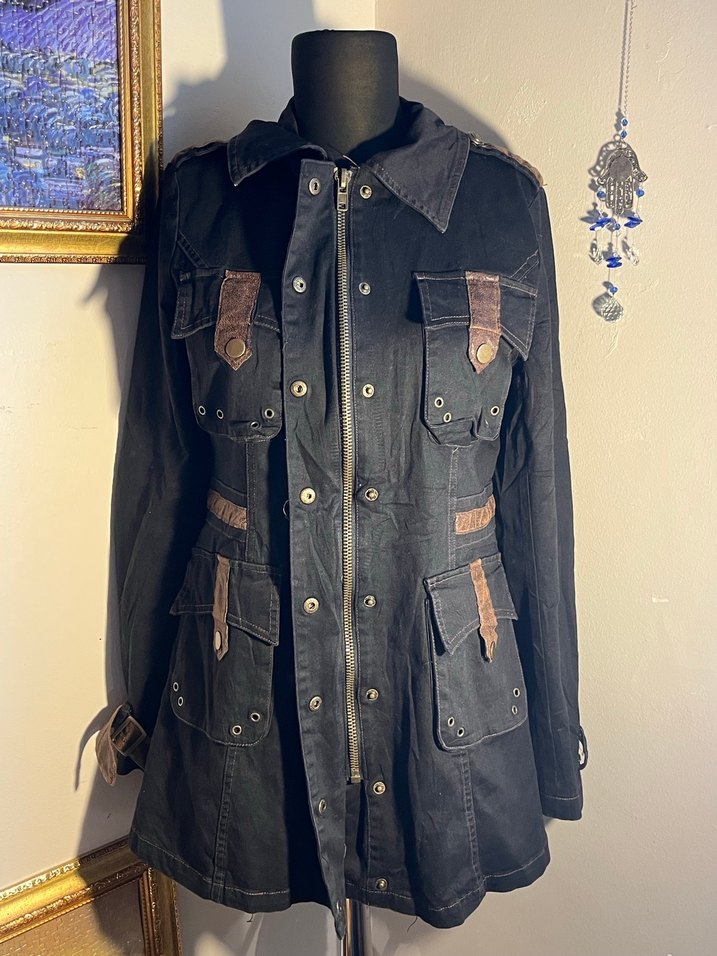Bu siyah denim ceket, kemerli bel ve çoklu düğmeli ceplere sahip. Notlu yakası, uzun kolları ve fermuarlı önü ile midi boyda, regular kesimdir.
