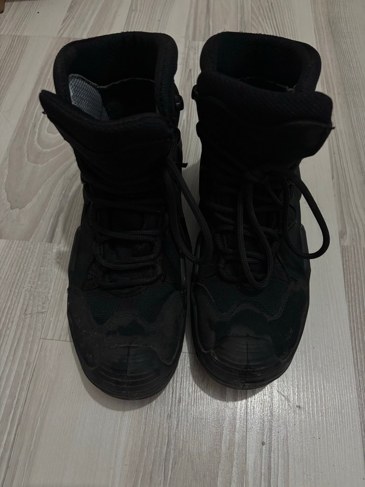 Kemerli, siyah kauçuk botlar koyu kamuflaj desenine sahip, dış mekan kullanımı için uygun grunge punk tarzında.