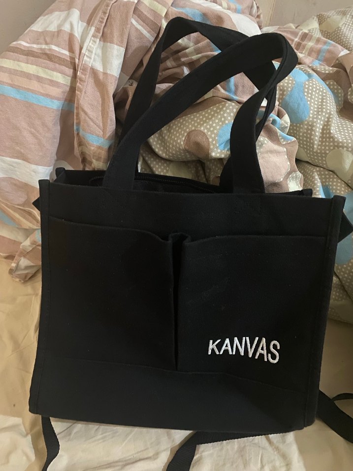 Siyah sentetik kumaştan, fermuarlı ve önünde 'KANVAS' baskısı olan minimalist sokak tarzı kadın çantası.