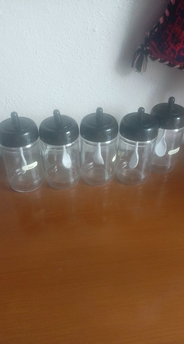 Siyah kapaklı, şeffaf gövdeli 5 adet bebek baharat.ve kullanımı kolay.