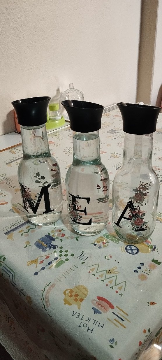 Üzerinde harfler ve çiçek desenleri bulunan, siyah kapaklı üçlü cam sürahi seti. İçecek sunumu için uygun.