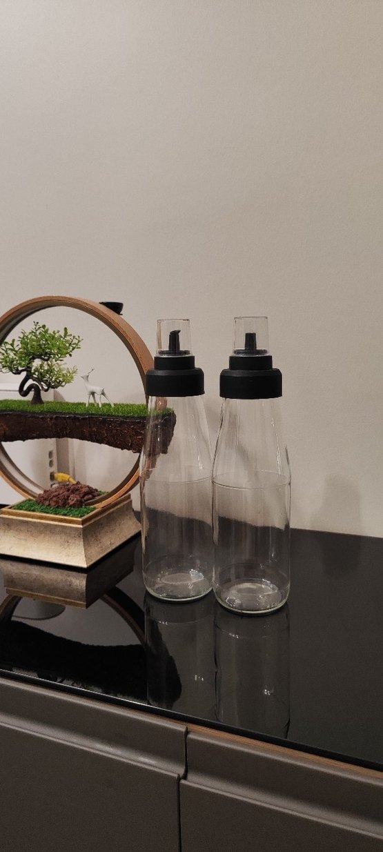 Siyah kapak ve pompalı, yağ ve sirke için uygun iki adet şeffaf cam şişe seti.