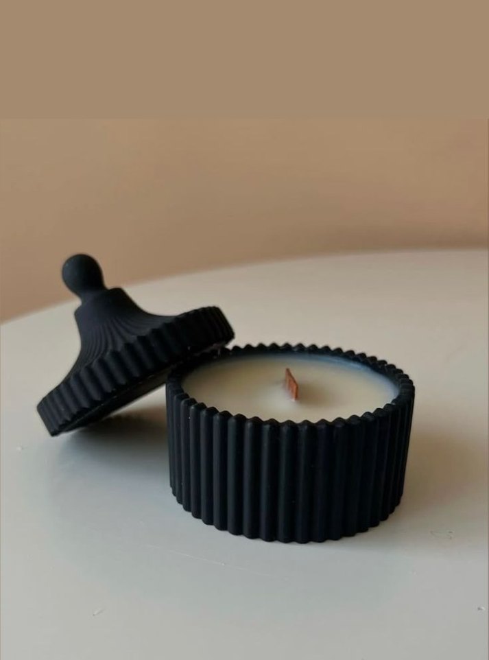 Dış yüzeyi dokulu siyah mum ve uyumlu kapağı, her mekana şık bir dokunuş katar. ️