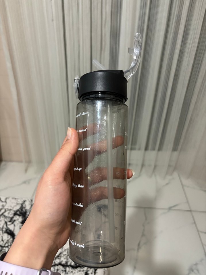 Şeffaf suluk, siyah kapak ve açılır pipet içerir. Yan tarafında ölçü işaretleri ve motive edici yazılar bulunur. Kolay kullanım sağlar.