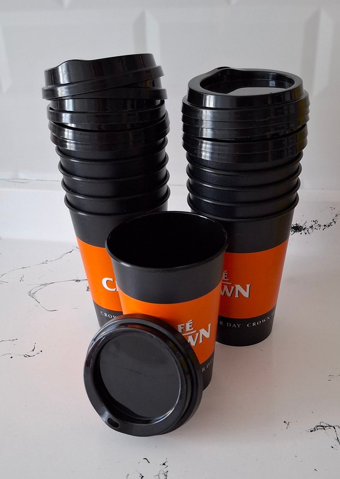 Siyah kapaklı, turuncu detaylı seyahat kupaları, üzerinde "CG" logosu bulunur. ☕ Adet fiyatı 20tl., 10adet var 200tl.