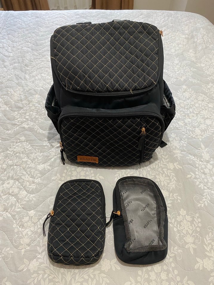Siyah kapitone desenli bebek bakım çantası, çoklu bölmeler ve ek küçük ceplerle düzenleme sağlar. Kullanışlı ve geniş hacimli.