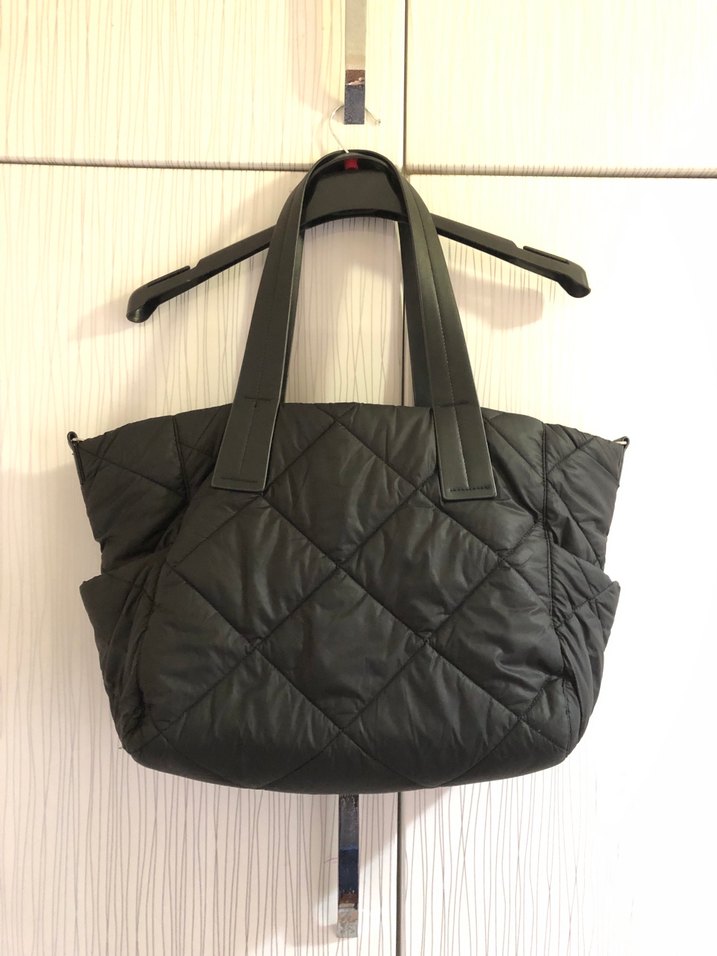 Yumuşak sentetik kumaştan siyah kapitone kadın omuz çantası, tokalı askılarla tamamlanmış, sokak modasına uygun.