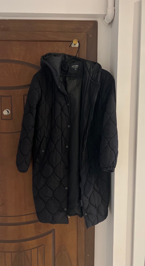 Siyah, uzun kollu, kapitone desenli ve düğmeli bu mont, rahat kesimi ve yumuşak kumaşıyla günlük sokak stili için uygundur. Hem fermuarlı hem cıtcıtlı 34 beden yazıyor ama 36 bedene tam oluyor 38 bedenkenfe bir kez giymiştim dogumdan sonra hıc giymedim 3/4 kez gıyıldı boyu omuzdan aşagıya 90 cm dıızn bıraz ustunde kalıyor