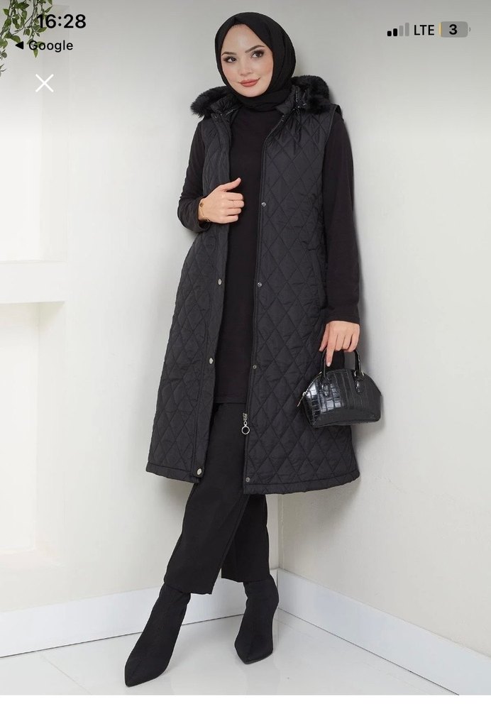 Siyah kapitone uzun sıfır kol yelek, kürk detaylı kapüşon ve sivri yaka ile rahat bir kesime sahiptir. Sentetik kumaştan yapılmıştır.