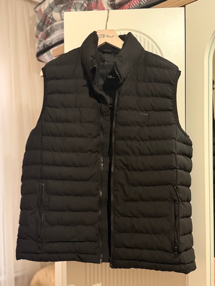 Siyah kapitone yelek, yüksek yakalı ve fermuarlı. İnce kesim, midi boy ve yanlarda fermuarlı cepler bulunur. Günlük rahat kullanım için sentetik kumaş.