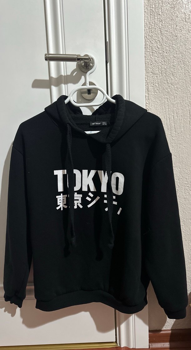 Tertemiz.Siyah kapüşonlu, bol kesim ve uzun kollu pamuklu sweatshirt. Üzerinde 'TOKYO' baskısı ve örgü detayları bulunur. Rahat sokak stili için uygundur.