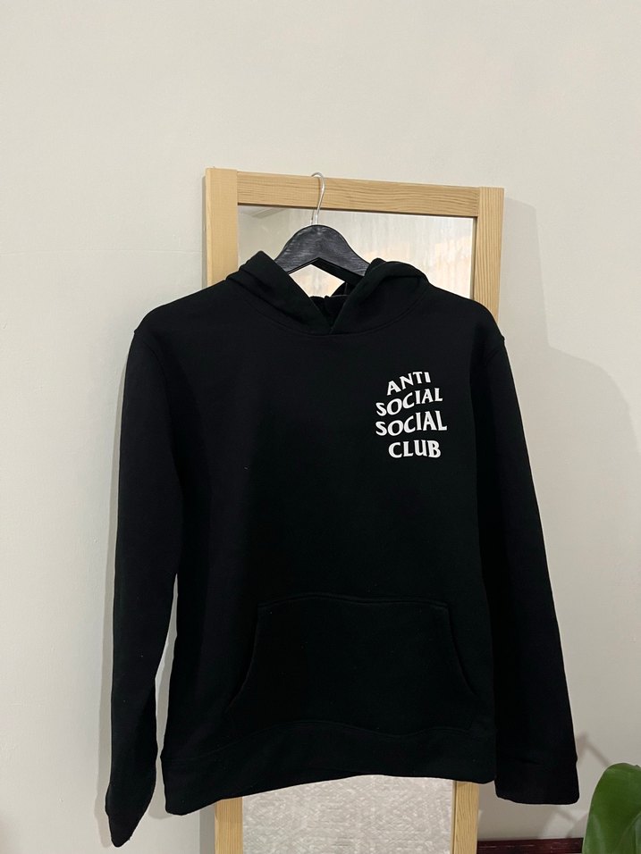 Siyah kapüşonlu sweatshirt. Önünde 'ANTI SOCIAL SOCIAL CLUB' baskısı bulunur. Uzun kollu, yuvarlak yakalı. Kalın değil.