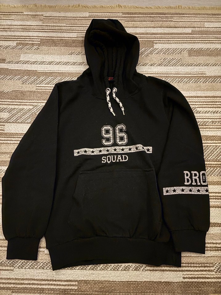 Siyah kapüşonlu sweatshirt, gevşek kesim ve örme detaylara sahiptir. Uzun kollu ve '96', 'SQUAD', 'BRO' baskılarıyla sokak stilini yansıtır. Yumuşak tüylü kumaştan yapılmıştır, günlük kullanım için uygundur.