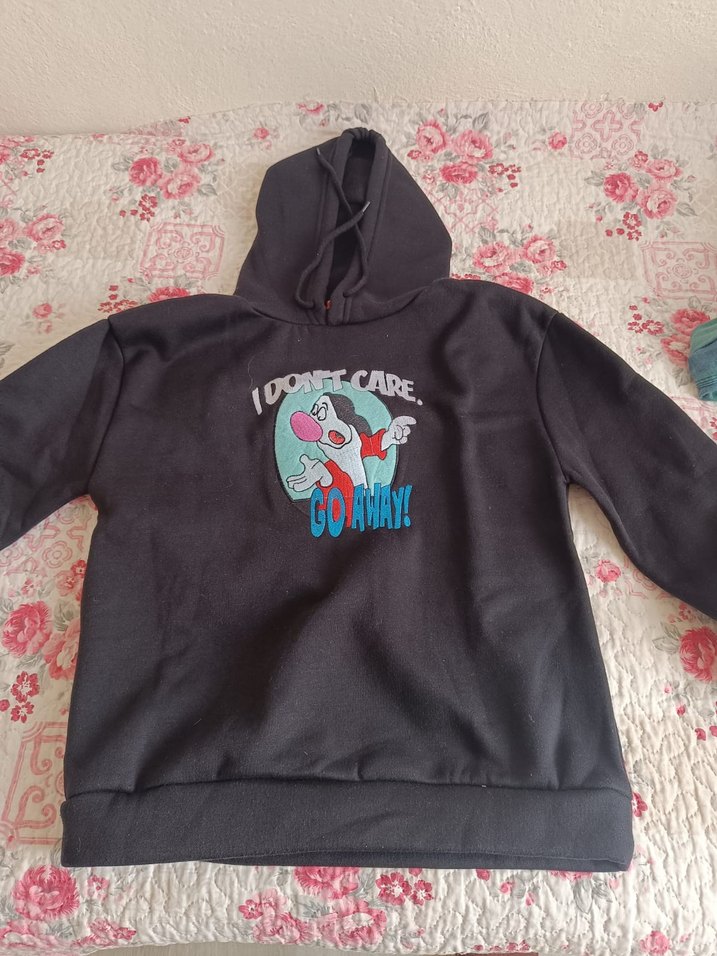 Siyah kapüşonlu, uzun kollu, bol kesim kadın sweatshirt. Örme dokusu ve önünde renkli baskı bulunmaktadır. Günlük kullanım için rahat bir seçenektir.