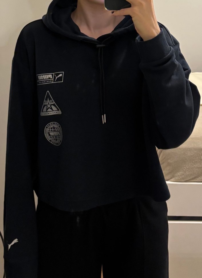 Siyah Kapüşonlu Baskılı Kadın Crop Sweatshirt