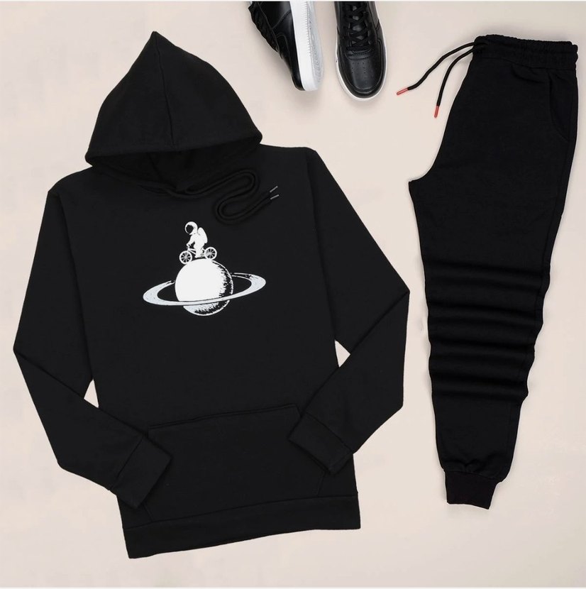 Siyah kapüşonlu üstü baskılı, yumuşak kumaştan yapılmış, uzun paçalı ve vücuda oturan erkek eşofman takımıdır.