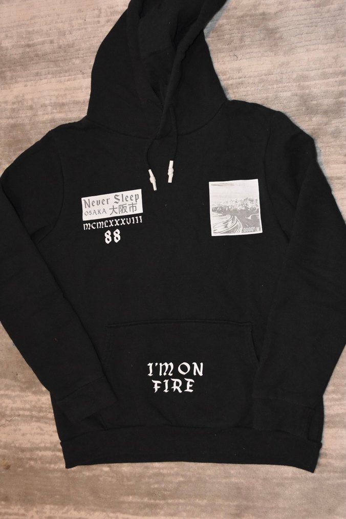 Siyah kapüşonlu sweatshirt, uzun kollu ve bol kesimdir. 'Never Sleep', '88' ve 'I'M ON FIRE' baskıları bulunur. Yumuşak ve sıcak kumaştan üretilmiştir. kol kısmında nokta kadar defosu vardır 3. resimde gösterilmiştir