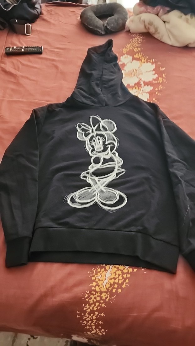 Siyah, kapüşonlu ve fermuarlı kadın sweatshirtü, uzun kollu ve baskılı Minnie Mouse deseniyle günlük kullanıma uygundur.ikikoltukarasi53cm boy55cmdir