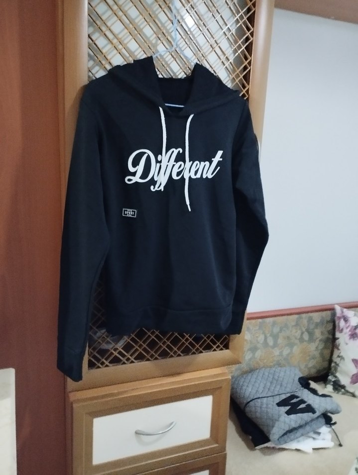 Siyah kapüşonlu, uzun kollu, bol kesim kadın sweatshirtü. kalın penyekumaştan, baskılı tasarımlı, günlük kullanıma uygun sokak stili.