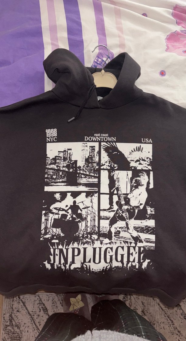 Pamuklu, siyah renkte, kapüşonlu ve uzun kollu, bol kesim kadın sweatshirt.