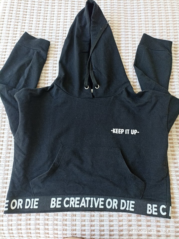 Yumuşak ve sıcak kumaştan, kapüşonlu, uzun kollu, baskılı ve cırt cırtlı siyah bol kesim sweatshirt. ✨