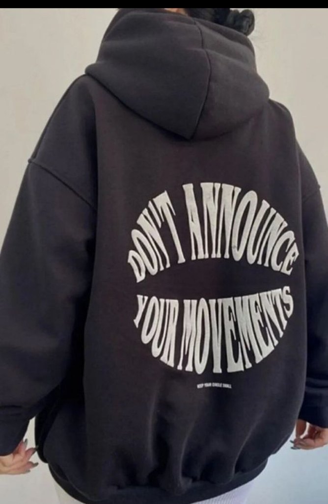 Siyah, kapüşonlu ve baskılı sırt yazılı, bol kesim kadın sweatshirt. Yumuşak sentetik kumaştan, günlük sokak stiline uygun.