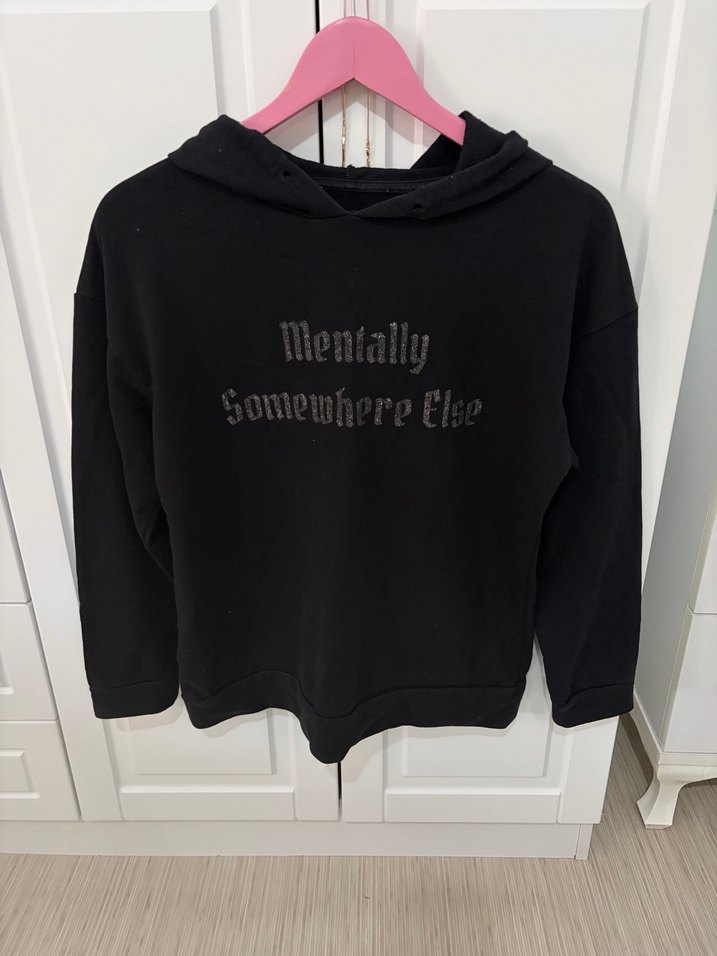 Siyah kapüşonlu sweatshirt, bol kesim ve "Mentally Somewhere Else" baskılı. Uzun kollu, yumuşak kumaşlı, günlük kullanım için uygun. Eski sezon