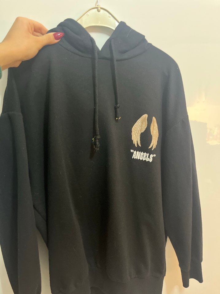 Siyah kapüşonlu, uzun kollu, baskılı ve fermuarlı oversize sweatshirt. Yumuşak ve sıcak kumaştan, günlük kullanım için uygundur.