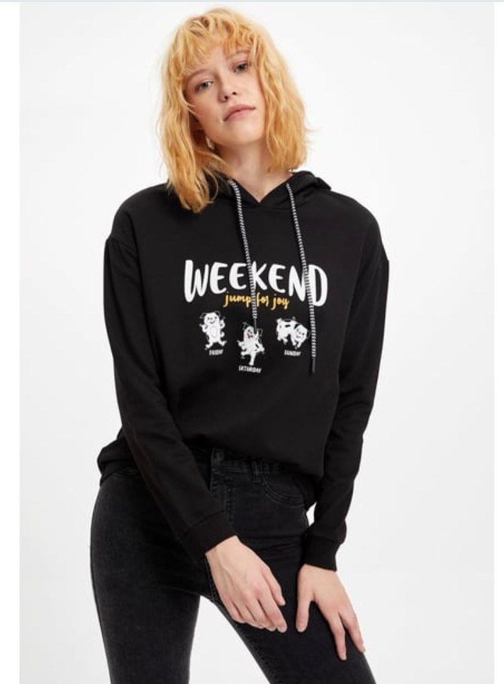 Siyah kapüşonlu sweatshirt, uzun kollu ve bol kesim. 'WEEKEND' baskılı, yumuşak ve sıcak kumaştan yapılmıştır. Rahat sokak stili için uygundur. İstenirse bendeki fotoğraflarını da atarım.