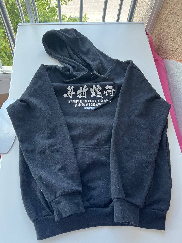 Siyah kapüşonlu sweatshirt, uzun kollu ve baskılı desenli. Yumuşak ve sıcak kumaştan, bol kesim ve fermuarlı detaylı, günlük sokak stili için uygun.