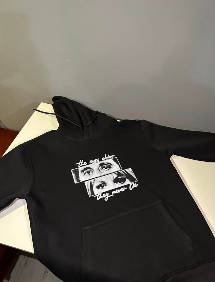 Siyah kapüşonlu sweatshirt, baskılı göz deseni ve rahat kesimi ile gündelik şıklık sunar. Uzun kollu ve kısa boylu, kolay şık bir görünüm sağlar. unisex her bedeni mevcut dilediğiniz baskı yapılır