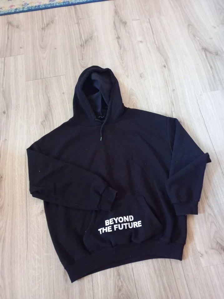 Siyah kapüşonlu sweatshirt, rahat kesim ve uzun kolludur. Ön cep kısmında 'BEYOND THE FUTURE' baskısı bulunur. Yumuşak ve sıcak kumaştan üretilmiştir.