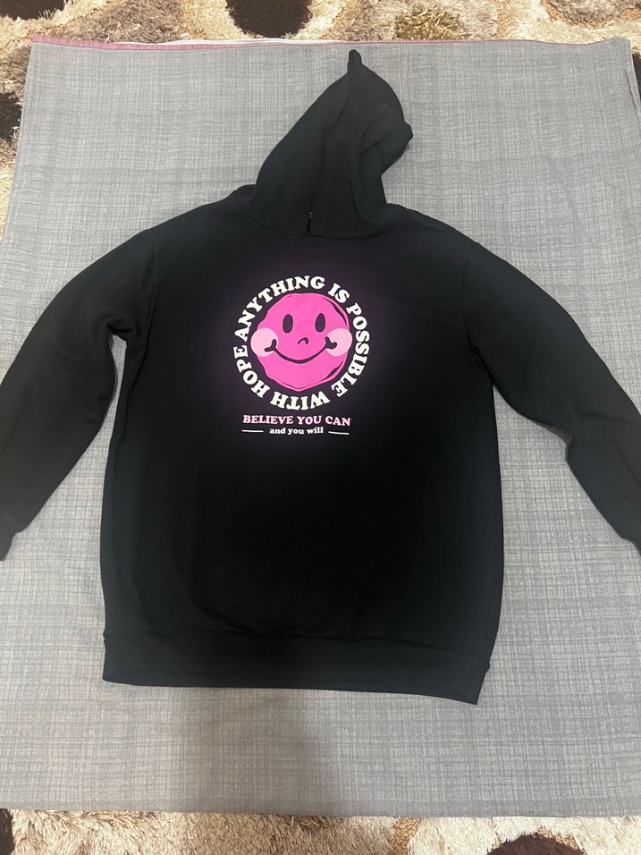 Yumuşak kumaştan, kapüşonlu ve uzun kollu siyah sweatshirt. Önünde pembe gülen yüz baskısı ve "Anything is possible with him" ile "BELIEVE YOU CAN" yazıları bulunur. Bir defa kullanıldı.Yepyeni,hiçbir deformasyonu yoktur.