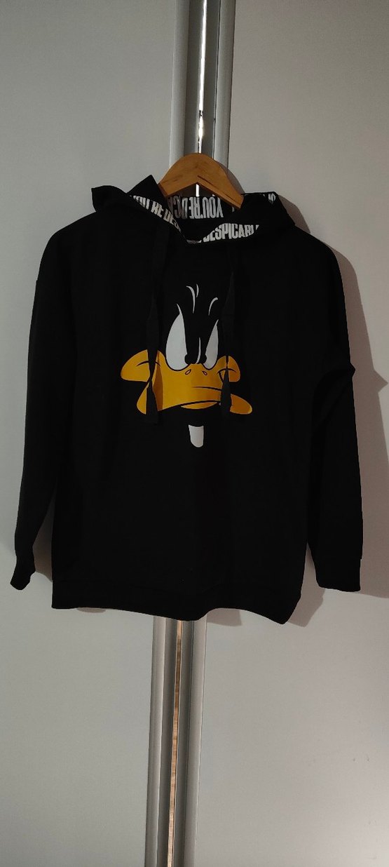 Siyah kapüşonlu oversize sweatshirt, bol kesim ve uzun kollu. Önü baskıli ve kapson etrafı baskılı Yumuşak, sıcak kumaştan üretilmiştir.