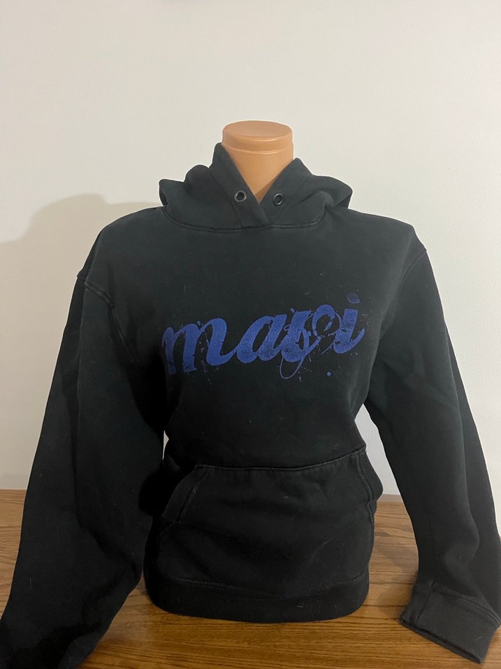 Siyah kapüşonlu sweatshirt, uzun kollu ve bol kesimdir. Yumuşak ve sıcak kumaştan, önünde baskılı desen ve örme dokusu vardır. Günlük kullanım için uygundur.