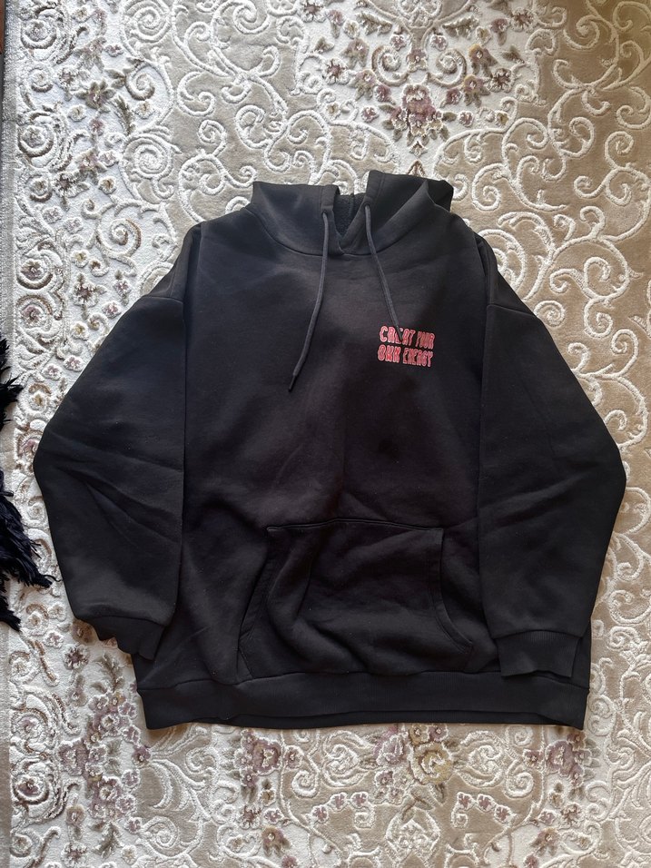 Siyah hoodie, genel olarak temiz durumda. sadece çok hafif tüylenme mevcut göze batmıyor. oversize kesim ve yumusak kumaslı. severek kullandığım bir sweatimdi. dolabımda yer açmak için satıyorum.