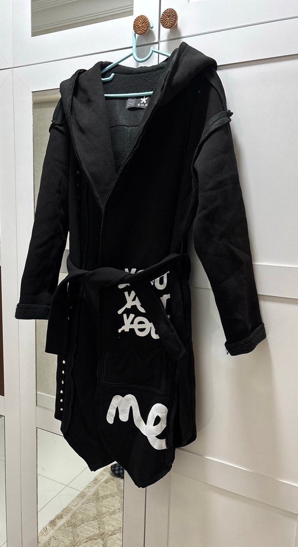 Siyah, kapüşonlu ve bel detaylı uzun kaban. Yumuşak ve sıcak kumaştan, bol kesim ve baskılı desenlidir.