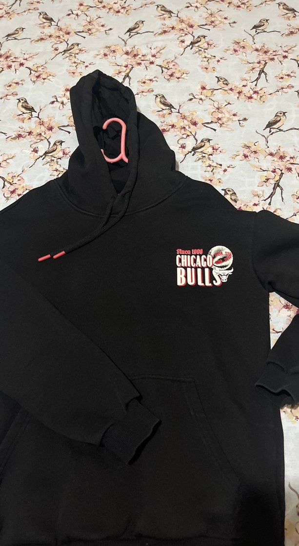 Siyah kapüşonlu, uzun kollu ve bol kesim sweatshirt. Chicago Bulls baskılı ve zincir detaylı, yumuşak ve sıcak kumaştan üretilmiştir.