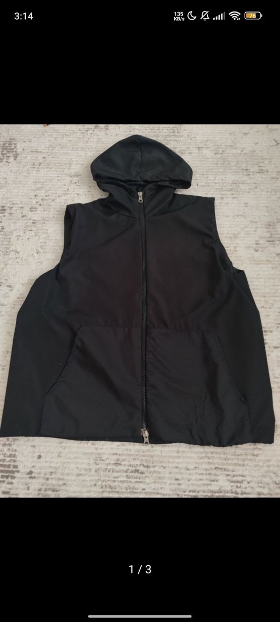 Siyah renkte, kapüşonlu ve fermuarlı kadın yeleği. Yüksek yakalı, kolsuz ve bol kesimdir. Midi boyda, günlük sokak tarzı için uygundur.
