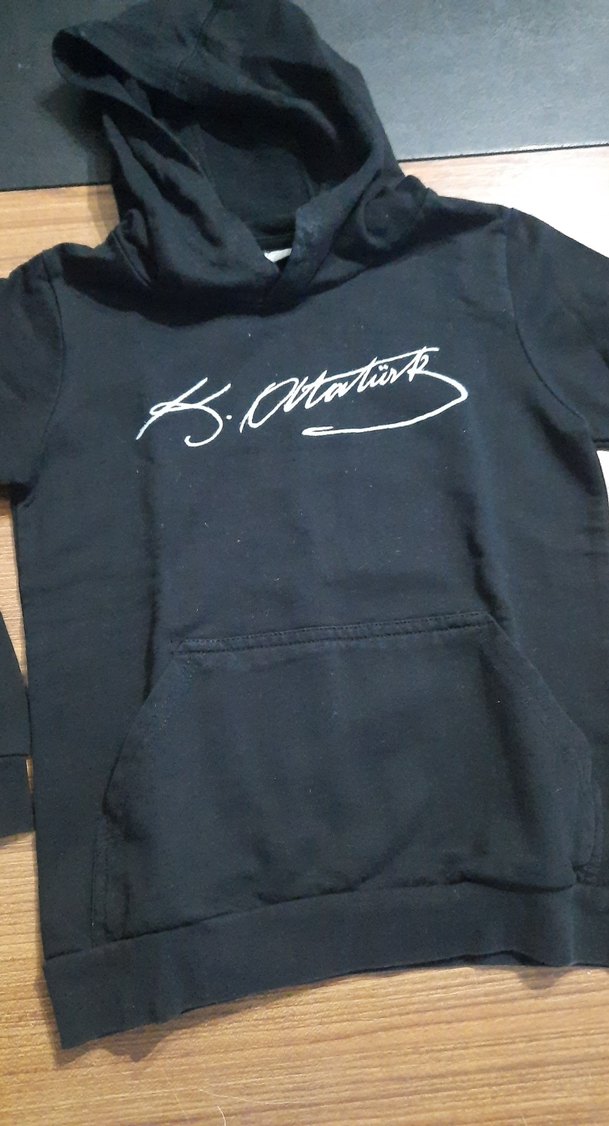 Siyah, kapüşonlu ve cepli, uzun kollu çocuk sweetshirt. 6-7 yaş için uyumlu. K.Atatürk imzalı temiz az kullanılmış. sorunsuz.
