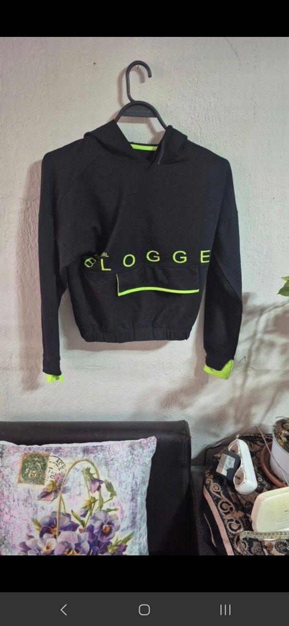 Siyah kapüşonlu, uzun kollu, bol kesim kısa sweatshirt. 'CLOGGE' baskılı ve cırt cırt detaylı, yumuşak ve sıcak kumaştan üretilmiştir. Spor ve günlük tarz için uygundur.