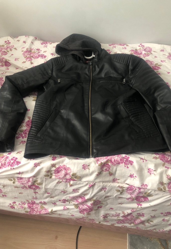Siyah deri biker ceket, kapüşonlu ve fermuarlı ön tasarıma sahiptir. Uzun kollu ve midi boyda, günlük sokak stiline uygundur.