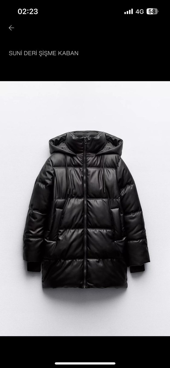 Siyah deri, kapüşonlu ve kürk detaylı, fitted kesim kadın kışlık kaban. Midi boy ve askılı kollarıyla sokak modasına uygun, sıcak tutar. Zara marka çok az giyildi