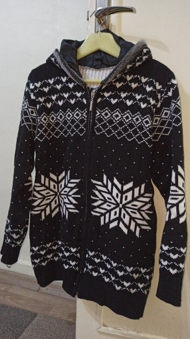 Siyah kapüşonlu, uzun kollu, desenli triko hırka, rahat ve şık bir görünüm sunar. ❄️