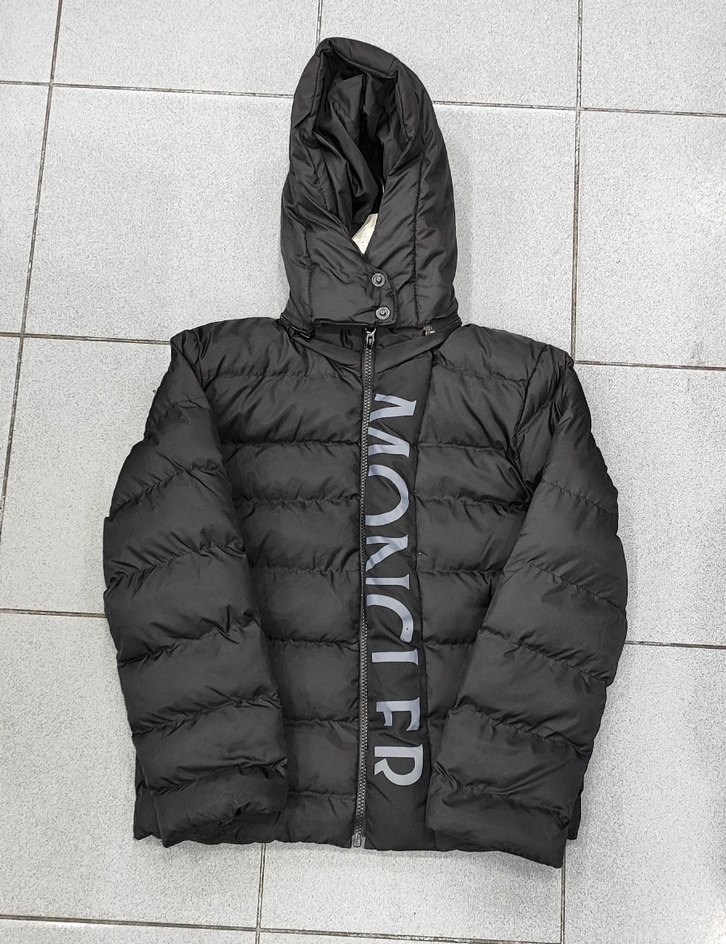 Siyah kapüşonlu kış montu, uzun kollu ve fitted kesimdir. Önü fermuarlıdır ve yumuşak, sıcak kumaştan üretilmiştir. Önünde MONCLER logosu bulunur.